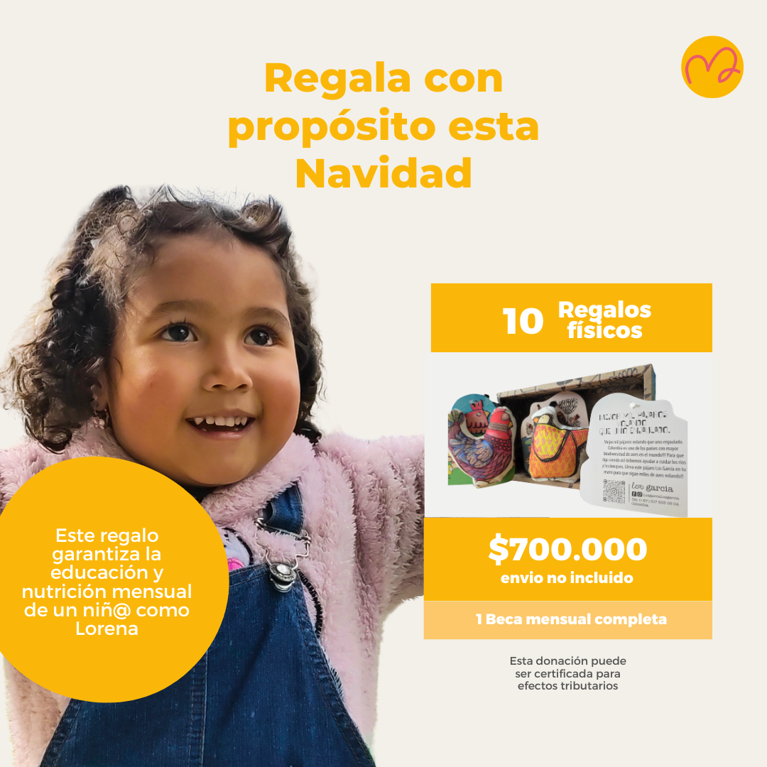 Recibe 10 regalos físicos para tu familia, amigos y clientes y garantiza una beca mensual completa para un niño o niña en 2025.